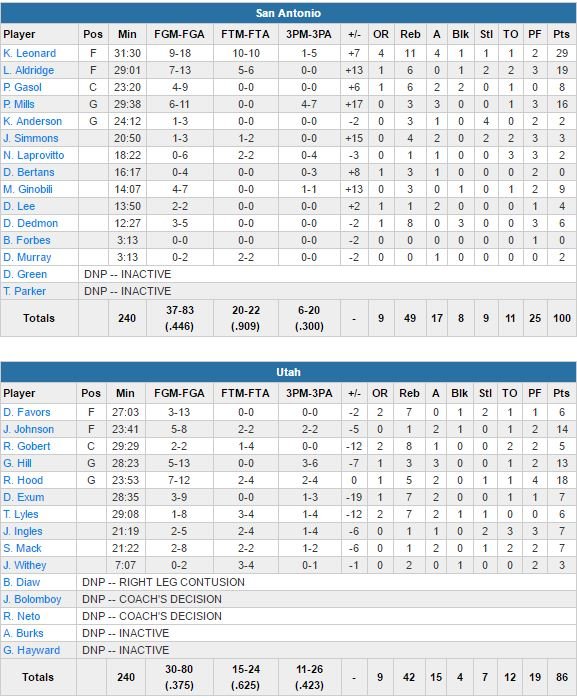 LaMarcus Aldridge ajoute 19 points et 6 rebonds, Patty Mills 16 points à 6/11, 3 rebonds et 3 passes en l’absence de Tony Parker, qui sera absent une semaine en raison d’une douleur au genou droit et qui n’était pas du voyage. Rodney Hood termine meilleur marqueur du Jazz avec 19 points, mais ce dernier ne shoote qu’à 37.5%. Rudy Gobert termine lui à 5 points à 2/2 et 8 rebonds.