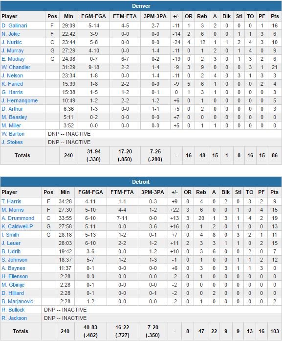 Sous l’impulsion d’un Andre Drummond qui comptait plus de rebonds que de points (19 points à 6/10, 20 rebonds et 3 contres) et de 5 autres joueurs à minimum 10 points, Detroit (qui n’a pas encore perdu au Palace of Auburn Hills cette saison) a déroulé face à Denver (21 points et 9 rebonds pour Wilson Chandler) cette nuit. Les Pistons (4V-2D) limitent leurs adversaires à 12 points dans le premier quart-temps et n’ont jamais été inquiétés (les Nuggets, rapidement menés 10-0 n’ont pas eu l’avantage un seule fois).