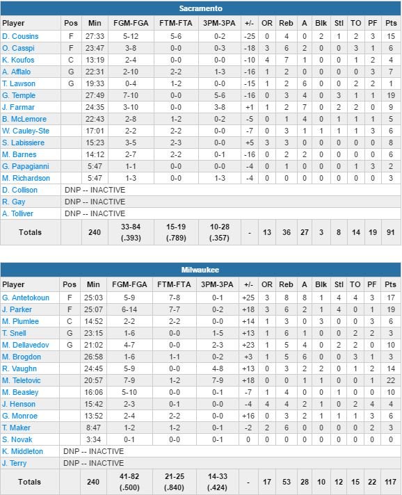 Milwaukee (4V-2D) a aussi décroché une troisième victoire de rang cette nuit aux dépens des Kings. Mirza Teletovic et Jabari Parker sont les meilleurs marqueurs de l’équipe avec 22 et 19 points tandis que Giannis Antetokounmpo termine à 17 points, 8 rebonds 8 passes et 4 interceptions. Les Bucks ont mis les choses au clair dans le premier et le troisième quart-temps, respectivement remportés 34-24 et 29-15. Voyant la défaite se profiler, les Kings n’ont pas forcé sur les minutes et DeMarcus Cousins termine à 15 points, 4 rebonds et 2 contres en 27 minutes.