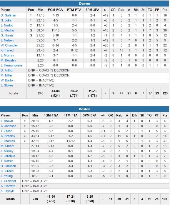 Le 7e choix de la draft 2015 a été bien épaulé par Wilson Chandler (néanmoins sorti pour une blessure aux ischio-jambiers, 22 points à 8/14, 5 rebonds et 2 passes), Danilo Gallinari (16 points à 7/13, 3 rebonds et 3 passes), Gary Harris (12 points à 5/10 et 4 rebonds) et Kenneth Faried (12 points à 2/4 et 11 rebonds). Isaiah Thomas a lui mené Boston avec 30 points (6/17, 11 rebonds et 6 passes), Avery Bradley suit avec 14 unités.