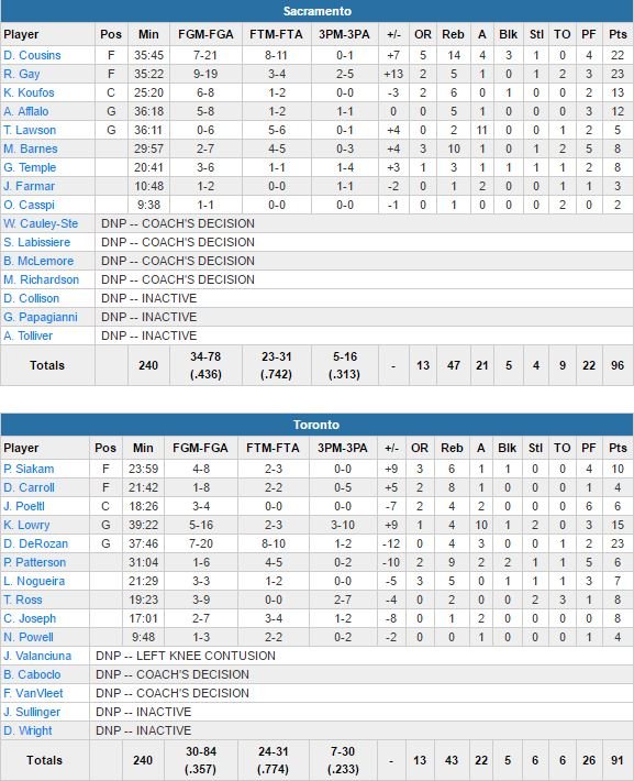 En déplacement à Toronto après 4 défaites consécutives, les Kings (qui jouaient le 5e et dernier match de leur road trip) sont allés chercher une belle victoire 96-91 à l’Air Canada Centre de Toronto. DeMarcus Cousins signe 22 points à 7/21, 14 rebonds, 4 passes et 3 contres, Rudy Gay à 23 points (dont 9 dans le quatrième quart-temps) à 9/19 et 5 rebonds contre son ancienne équipe.