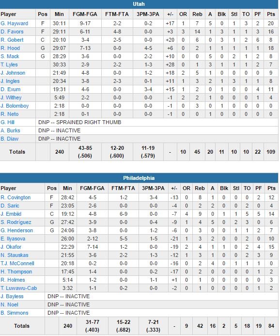 Derrick Favors ajoute 16 points et 14 rebonds et Rodney Hood 18 face à des Sixers toujours sans victoire (0-6, la routine puisque c’est le cas pour la troisième saison consécutive. Utah remporte de son côté son deuxième match d’affilée à l’extérieur après New York. Décrits comme mous toute la soirée par Jahlil Okafor (15 points à 7/14 et 4 rebonds), les Sixers ne se sont donnés aucune raison d’y croire.