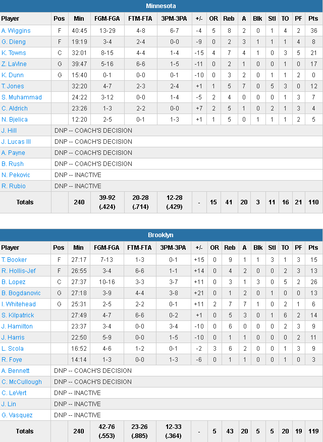 Toujours pas de victoire à l’extérieur pour les prometteurs Wolves, cette fois battus à Brooklyn par les Nets, 119-110. Ces derniers ont dû donner des cheveux blancs à Tom Thibodeau car leur attaque a pris le dessus sur la défense de l’ancien Bull. Brook Lopez signe 26 points à 10/16 et 5 autres Nets marquent au moins 11 points (8 à au moins 9). Les Nets ont shooté à 55.3% dont un 12/33 à trois points malgré l’absence de Jeremy Lin et Greivis Vasquez à la mène.
