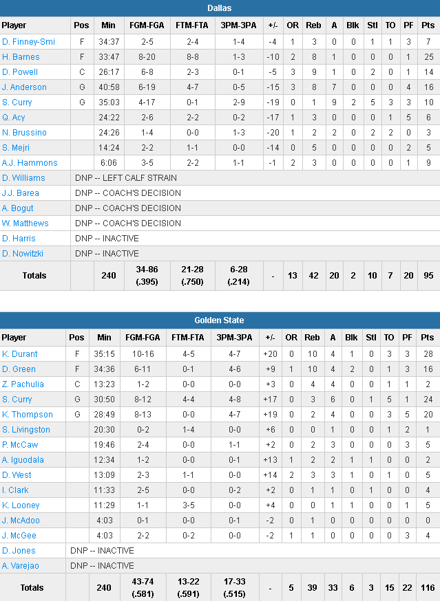 6ème victoire de la saison pour les Golden State Warriors, qui ont disposé sans aucun souci de l’équipe B des Dallas Mavericks 116-95. Dallas était privé de Dirk Nowitzki, Andrew Bogut, Deron Williams et Wesley Matthews et n’a logiquement pas fait le poids face à l’armada californienne.