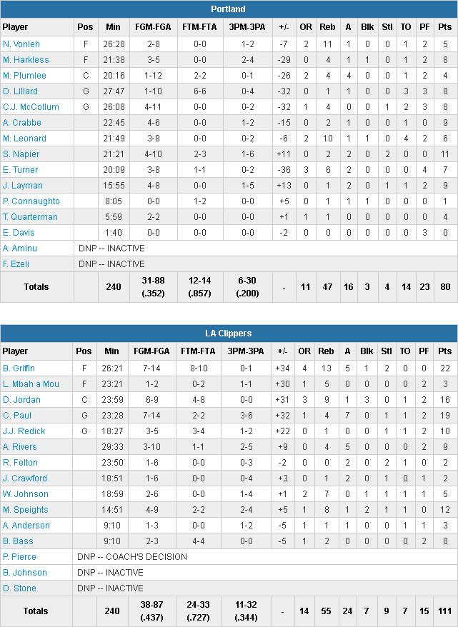 Il n’y a pas eu de match puisque les Clippers comptaient déjà 29 points d’avance à la pause sous l’impulsion de leur défense et du trio Blake Griffin (22 points, 13 rebonds et 5 passes), Chris Paul (19 points et 7 passes) et DeAndre Jordan (16 points à 6/9). Les Californiens ont limité Portland à 35.2% au tir, et un seul joueur a dépassé les 10 points, Shabazz Napier (11 points) ! Le 5 majeur a vécu un cauchemar puisque les deux hommes chauds du moment, Damian Lillard (8 points à 1/10) et CJ McCollum (8 points à 4/11) ont combiné 16 points à 5/21.