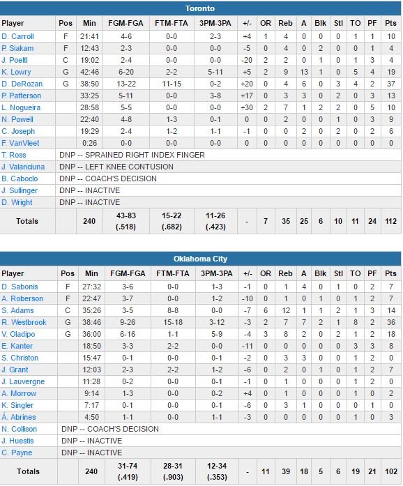 Toronto mène 62-55 à la mi-temps derrière 22 points de DeRozan. L’équipe a bien profité des 11 ballons perdus du Thunder en première mi-temps (16 points marqués après pertes de balles adverse). L’écart atteint les 11 points dans le troisième quart, ce qui va provoquer un temps-mort de Billy Donovan. Sur un shoot mi-distance dans les dernières secondes de la période, DeRozan donne 13 points d’avance aux siens, 88-75.