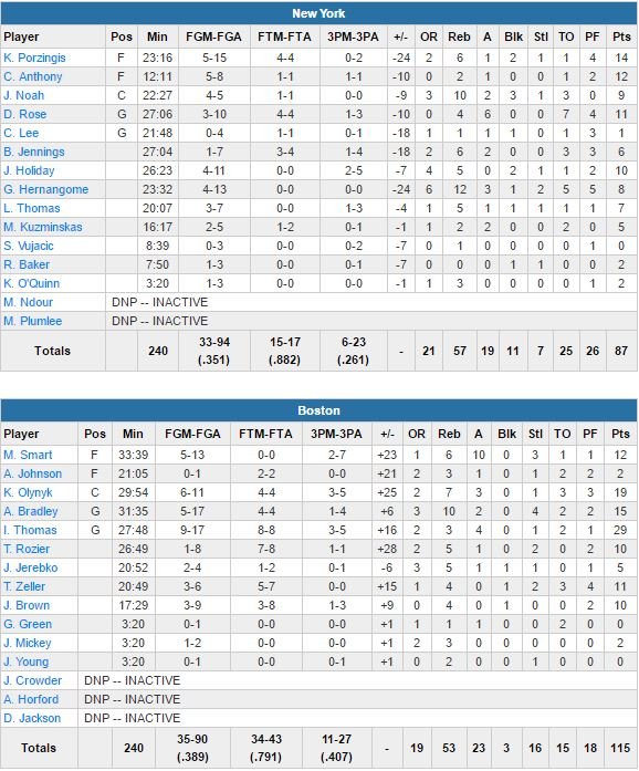 Frustrés par leurs 3 défaites consécutives à Cleveland, contre Denver et à Washington, les Celtics se sont vengés sur des Knicks qui restaient sur une victoire contre Brooklyn. Porté par les 29 points (dont 23 en 1ère mi-temps, 9/17, 4 passes) d’Isaiah Thomas, Boston s’impose 115-87.