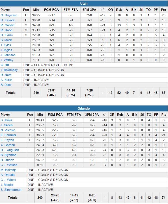 En visite à Orlando, le Jazz a bien rebondi de sa défaite à Charlotte en s’imposant 87-74 cette nuit. Gordon Hayward et Derrick Favors terminent co-meilleurs marqueurs d’Utah avec respectivement 20 points à 6/17, 8 rebonds et 10 passes et 18 points à 7/14, 9 rebonds et 2 contres.