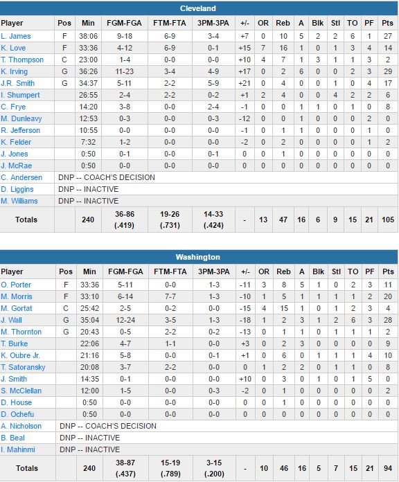 À noter : LeBron James semblait souffrir du dos après une faute adverse à 7 minutes de la fin mais il est resté dans le match. Smith a pris une faute flagrante 1 dans le 3ème quart. Kelly Oubre Jr a inscrit les 8 derniers points d son équipe dans un premier quart remporté 31-26 par Washington.
