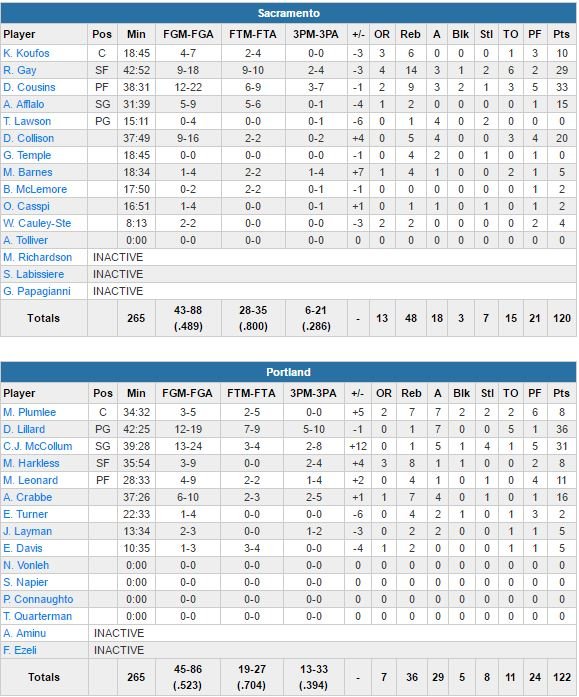 La rencontre entre les Kings et les Blazers à Portland s’est jouée dans les dernières secondes en prolongation cette nuit. Portland en sort vainqueur avec un énorme duo Damian Lillard (36 points à 12/19 et 7 passes) – C.J. McCollum (31 points à 13/24 et 5 passes) et il fallait bien ça pour contrer l’association DeMarcus Cousins (33 points à 12/22 et 9 rebonds) – Rudy Gay (29 points à 9/18 et 14 rebonds).