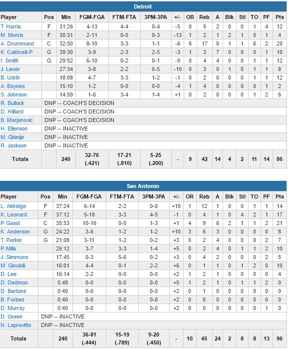 Emmenés par un Pau Gasol à 21 points à 10/16, 9 rebonds 6 passes et 2 contres cette nuit, les Spurs ont mis fin à une série de 3 défaites à domicile en dominant les Pistons d’Andre Drummond (20 points à 8/10 et 17 rebonds), qui perdent une 3ème rencontre consécutive. Kawhi Leonard signe 17 points, LaMarcus Aldridge 14 points et 12 rebonds et Tony Parker 7 points et 4 passes en 21 minutes après 4 matchs d’absence (genou droit). Les Pistons ont pris jusqu’à 14 points de retard dans le 4ème quart avant de tenir San Antonio à 2 points pendant 4 minutes pour recoller à 89-84 à 2 minutes de la fin. Leonard scellera finalement le sort du match à 3-points.