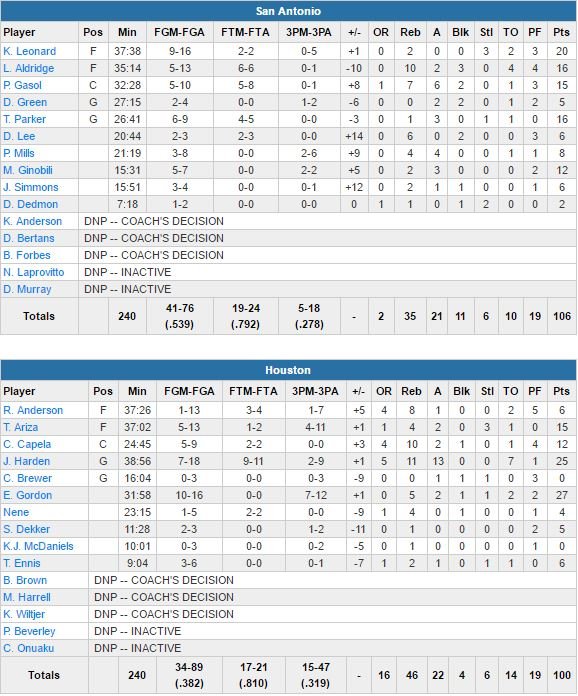 À noter : Tony Parker et LaMarcus Aldridge terminent à 16 points, Pau Gasol 15 et Manu Ginobili 12. Harden a rentré un buzzer à presque 12m pour donner 4 points d’avance à Houston (qui doit attendre 3 minutes avant de marquer ses premiers points) 26-22 après un quart-temps. Les Spurs menaient 49-40 à la pause.
