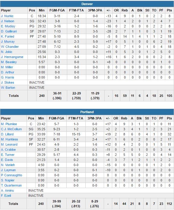 Portland démarre sur un 13-7 marqué par un alley oop dunk de Meyers Leonard mais Denver revient vite dans le match et mène 28-20 sur un 3-points de son rookie Jamal Murray (19 ans, 1,93m, 7ème choix de la draft). Jusuf Nurkic aggrave ensuite l’avantage des siens 48-31 en milieu de 2ème quart sur un hook shot et Maurice Harkless ramène les siens à 52-46 sur un layup. Menés de 7 points à la pause, les Blazers recollent à 58-55 sur un layup signé McCollum puis repassent devant 61-60 sur un 3-points d’Harkless, qui enchaîne ensuite en contre-attaque, 73-64.