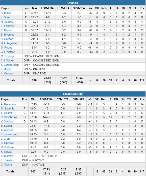Les deux équipes à égalité dans la dernière minute, Russell Westbrook (énorme avec 41 points à 14/21, 12 rebonds et 16 passes, son 40ème triple-double en carrière) va manquer l’un de se fameux pull-up. Orlando prend le rebond et un temps-mort alors qu’il reste 11 secondes à jouer. Le Thunder (3ème défaite consécutive, toutes à domicile) restait sur 20 victoires consécutives lorsque leur meneur star était en triple-double. Victor Oladipo, qui jouait lui aussi contre son ancienne équipe, termine à seulement 12 points à 6/9 et 2 passes.
