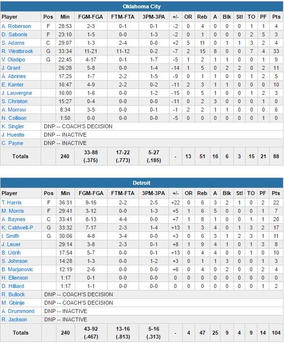 Russell Westbrook est comme à son habitude très complet (33 points à 11/21, 15 rebonds et 8 passes) mais ses 7 ballons perdus ne font une nouvelle fois pas du bien à son équipe. Ses 4 autres coéquipiers titulaires sont transparents dans ce match (8/28 aux tirs cumulé), et seuls Enes Kanter (10 points à 4/9) et Jerami Grant (11 points à 5/8 et 5 rebonds) en sortie de banc arrivent à tirer leur épingle du jeu.