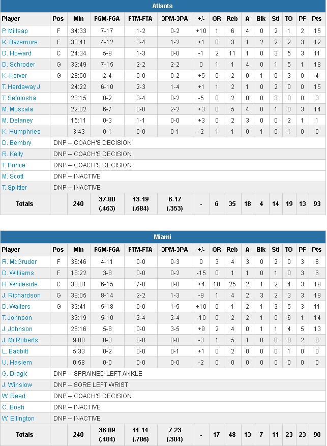 Miami, mené par un énorme Hassan Whiteside (19 points à 6/15 et 25 rebonds) et Josh Richardson (19 points), et privé de Goran Dragic, est revenu à 1 point à 13.6 secondes de la fin sur un 7-2 et une dernière claquette de Rodney McGruder. Kent Bazemore a répondu par deux lancers mans dans la foulée Richardson est monté au dunk, 91-90 Atlanta avec 11 secondes à jouer. Schröder a été envoyé sur la ligne et a rentré ses deux lancers, et derrière, sans temps mort, Dion Waiters a raté son shoot à 3-pts au buzzer.