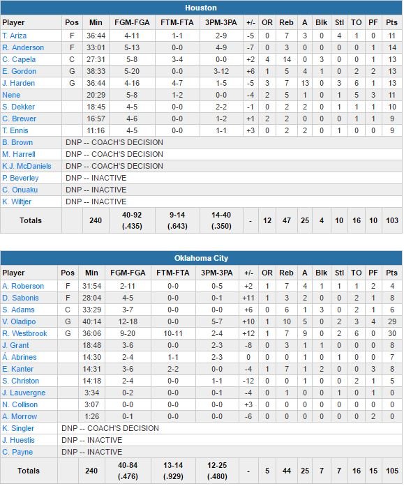 Houston se relance dans le 3ème quart avec un 14-5 pour prendre 7 points d’avance 77-70, provoquant un temps-mort de Billy Donovan. L’écart va pourtant atteindre les 13 points avant qu’OKC ne revienne à 5 points à la fin de la période, 90-85. Oladipo égalise à 100 partout sur un 3-points à moins de 3 minutes de la fin puis Roberson sur un alley oop servi par Westbrook met définitivement le Thunder devant. À 28 secondes du buzzer, Westbrook rentre un lancer-franc pour le +3. Harden et Trevor Ariza (11 points, 7 rebonds, 4 interceptions) ne se trouvent pas alors que ce dernier était ouvert dans le corner et Westbrook en profite pour aller claquer son dunk sur Capela (13 points, 14 rebonds et 3 contres) et tuer le match.
