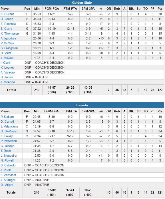 Lui et Curry inscrivent 10 points chacun dans le deuxième quart et Golden State va limiter ses adversaires à 5/24 sur la période. Résultat les Warriors bouclent leur première mi-temps sur un 23-6, transformant un déficit de 4 points en avantage de 13, 66-53. Toronto n’avait pas encaissé autant de points en première mi-temps depuis le 25 janvier 2014 contre les Clippers (71). L’écart atteint les 19 points durant en début de 3ème quart-temps, mais DeRozan score 19 points pour ramener les siens à 95-86 avant de jouer le dernier quart. Le banc de Golden State va alors reprendre 16 points d’avance. Avance qui tiendra jusqu’au bout malgré le retour à 4 points des locaux à 13 secondes du buzzer final.