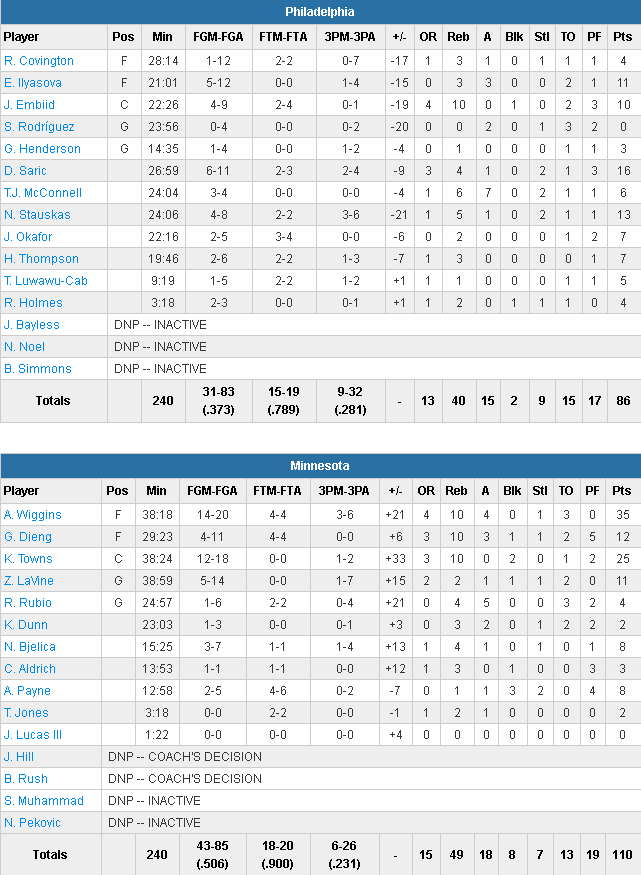 Après 4 premières minutes équilibrées, 7-7, Minnesota a passé un petit 6-0 pour prendre les commandes et ne plus jamais les lâcher. Grâce aux 16 points en combiné de Wiggins et Towns dans le premier acte et au 7/22 des Sixers, les locaux ont viré en tête 27-18 après 12 minutes. Ils ont passé un 10-0 à cheval entre la fin du premier quart et le début du second pour porter le score à 35-18 sous l’impulsion de leurs deux stars. Les Sixers ne s’en sont jamais remis et ont laissé leur adversaire s’envoler, 44-27, 56-32 et finalement 61-33 à la pause.