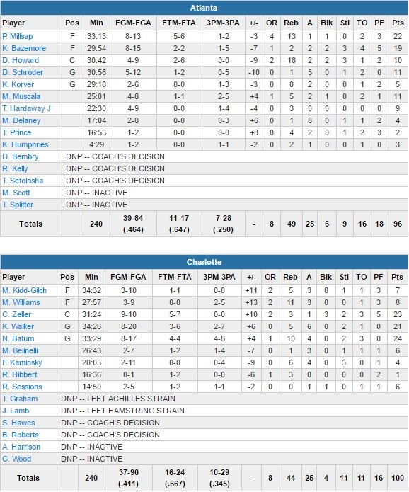 Charlotte revient à 3 points sur un 3-points de Kyle Korver (dont l’équipe restait sur 6 victoires consécutives) alors qu’il reste environ une minute à jouer mais c’est ensuite au tour de Zeller de calmer le jeu avec un dunk plus la faute qui scelle définitivement le sort du match.