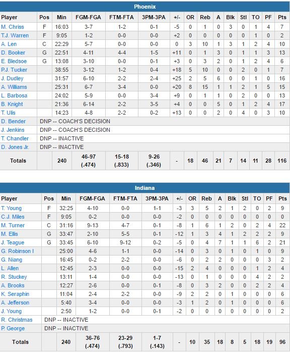 Aucun banc n’a marqué autant de points cette saison : 78 points pour celui des Suns (46 rebonds à 35, 11 turnovers à 18) cette nuit contre Indiana ! 5 des 7 joueurs à au moins 10 points étaient remplaçants pour Phoenix dans une victoire de 20 points sur des Pacers (1/7 à 3-points) qui restaient sur 2 victoires. Brandon Knight termine meilleur marqueur avec 17 points à 6/14 et 5 passes alors qu’en face, Myles Turner (22 points à 9/13, 6 rebonds et 2 contres) et Jeff Teague (21 points à 6/10, 4 rebonds et 7 passes) n’ont pas été mauvais en l’absence de Paul George (cheville). Kevin Seraphin joue 11 minutes pour 6 points à 2/4 et 2 rebonds.
