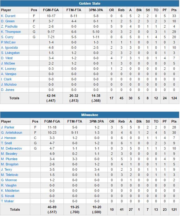 Mais sur les 8 dernières minutes du match, les hommes de Steve Kerr, se montrant un peu trop satisfaits, seront dominés 24-7. Malgré tous leurs efforts, les Bucks, qui auront pourtant l’occasion d’égaliser à plusieurs reprises (Jabari Parker -28 pts à 11/18, 5 rebonds et 5 passes- et Giannis Antetokounmpo -30 pts à 10/23, 4 rebonds et 6 passes- mènent un 13-4 en faveur de Milwaukee pour recoller à 122-120 à 2 minutes et demi du buzzer), ne parviennent pas, que ce soit par la malchance ou les stops adverses, à revenir pour de bon. C’est finalement Thompson qui tuera le match aux lancers-francs avec un 2/2 à 8 secondes de la fin.