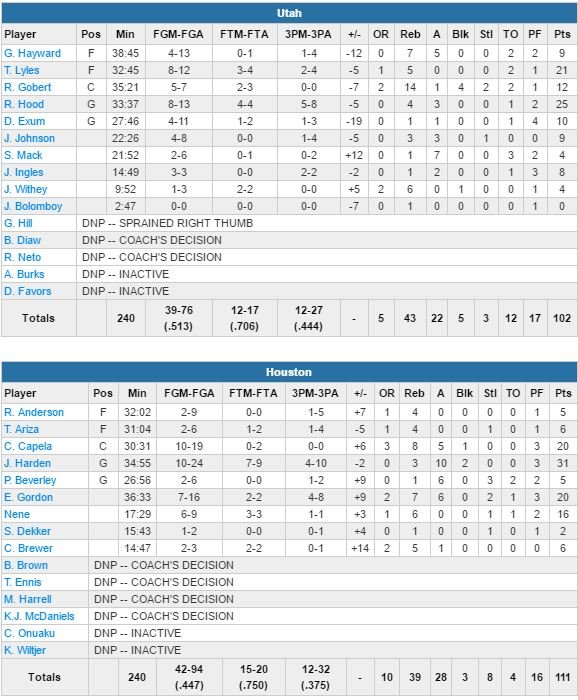 En dehors de Gordon Hayward (4/13), les 4 autres titulaires du Jazz (sans Derrick Favors, touché au genou -contusion- et George Hill – entorse du pouce droit-) cumulent seulement 7 années d’expérience NBA. Rodney Hood termine meilleur marqueur de son équipe avec 25 points, suivi par Trey Lyles (21 points, titulaire à la place de Boris Diaw, laissé au repos) et Rudy Gobert, 12 points, 14 rebonds et 4 contres. Houston a dominé 52-46 dans la peinture pour un 12/32 à 3-points (l’équipe tourne habituellement à 13.7 trois-points pour 36.5 tentatives par match).