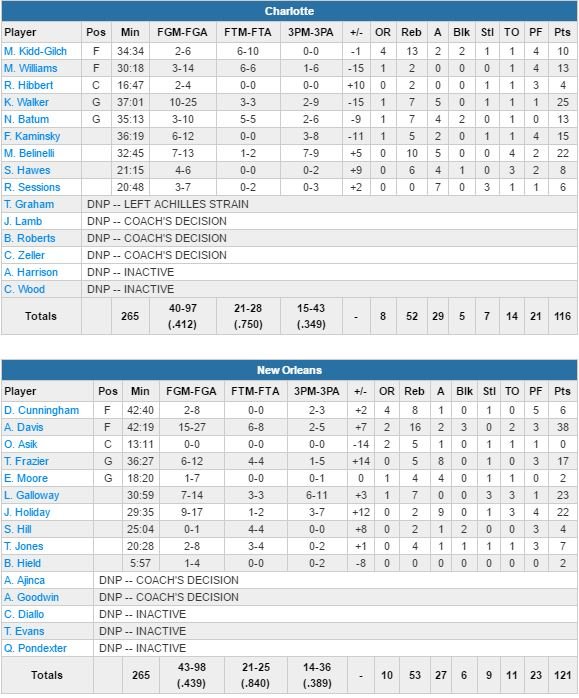 Il égalise à 18 secondes de la fin dans le 4ème quart avant de réussir une claquette suite à un shoot manqué d’Holiday en prolongation pour donner l’avantage aux siens pour de bon. Batum rentre 3 lancers-francs après une faute de Galloway à 42 secondes restantes pour permettre à Charlotte de recoller à 116-115. Mais après un temps-mort, Davis plante un floater main droite, 118-115. Holiday et Tim Frazier (17 points à 6/12, 5 rebonds et 8 passes) assurent ensuite la victoire aux lancers-francs.