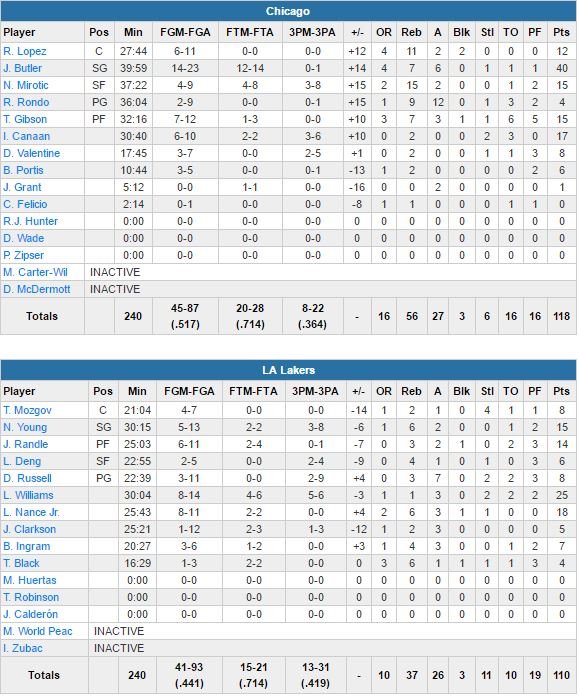 Devant de jusqu’à 10 points, les Lakers ont craqué en deuxième mi-temps cette nuit face aux Bulls (2ème défaite d’affilée) de Jimmy Butler (40 points à 14/23, 7 rebonds et 6 passes), Isaiah Canaan (17 points), Nikola Mirotic (15 points et 15 rebonds) et Rajon Rondo (4 points, 9 rebonds et 12 passes malgré une cheville gauche douloureuse). Chicago s’impose 118-110 et remporte un 5ème succès en 6 matchs.