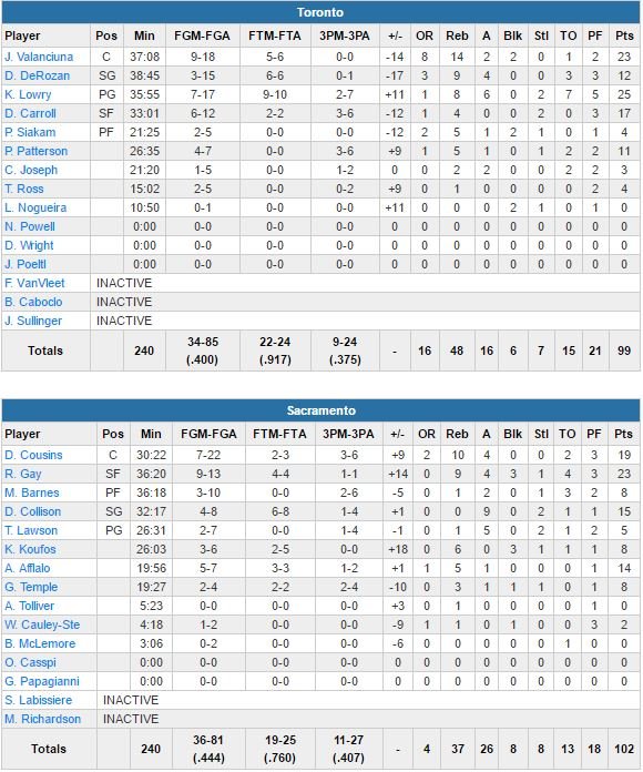 DeMar DeRozan, meilleur marqueur de la ligue, a été tenu à 3 points en seconde mi-temps. Kyle Lowry signe 25 points et 8 passes, Jonas Valanciunas 23 points et 14 rebonds et DeMarre Carroll 17 points, mais DeRozan, défendu par Gay, reste bloqué à 12 unités (3/15), son plus petit total de la saison. DeMarcus Cousins épaule Gay avec 19 points et 10 rebonds, Darren Collison 15 points et 9 passes et Arron Afflalo 14 points pour une équipe de Sacramento qui avait bien besoin d’un succès après s’être incliné dans 8 de ses 10 derniers matchs.