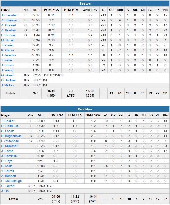Les Nets, menés par les 23 points de Sean Kilpatrick, les 18 points et 12 rebonds de Trevor Booker et les 14 points de Bojan Bogdanovic, perdent de leur côté un 5ème match consécutif. Boston prend un excellent départ (11-2) et se retrouve devant 30-16 après un quart-temps. Brooklyn répond néanmoins par un 21-6 (12 points de Bogdanovic) dans le deuxième. Son équipe égalise à 60 partout dans le troisième (pas le quart-temps préféré des Nets cette saison) mais un nouveau run de Boston (19-6) fait basculer définitivement le match en faveur des verts.