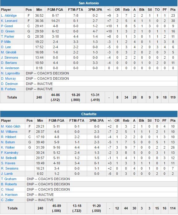 Le match n’a néanmoins pas été facile pour les coéquipiers de Tony Parker (11 points à 3/10 et 3 passes) face à ceux de Nicolas Batum (13 points à 5/9, 7 rebonds et 5 passes), menés par les 26 points à 9/16, 9 rebonds et 7 passes de Kemba Walker, dont l’équipe compte 8 joueurs à au moins 10 points hier. Les deux équipes entament le 4ème quart-temps à égalité 84 partout dans un match qui a compté pas moins de 28 changements d’avantage sur les 3 premiers quarts-temps.