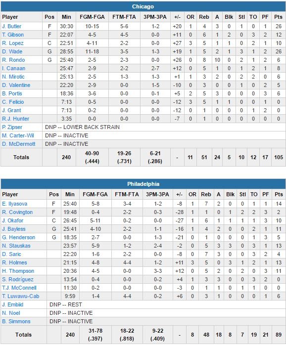 Rajon Rondo ajoute 6 points, 8 rebonds et 10 passes. Sans Joel Embiid, les 76ers, menés par les modestes 14 points d’Ersan Ilyasova, n’ont pas fait preuve de beaucoup de résistance et le score aurait pu être bien moins flatteur si Fred Hoiberg n’avait pas fait jouer ses remplaçants après 5 minutes de jeu dans le 4ème quart-temps (l’écart était alors de 28 points en faveur de Chicago). C’est dans le 3ème quart-temps que les Bulls se détachent définitivement avec un 33-17 pour entamer le dernier quart en tête 90-64.