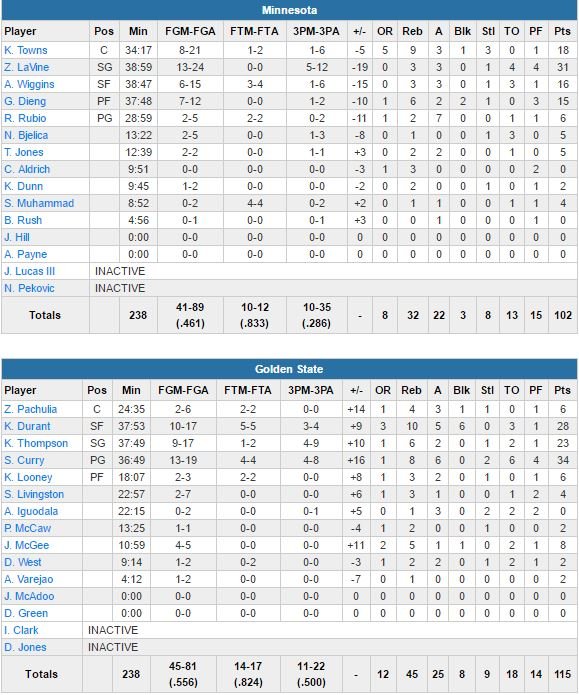 Zach LaVine a signé 31 points à 13/24 et 5/12 de loin, 3 rebonds et 3 passes et Karl-Anthony Towns 18 points (dont 12 dans le 1er quart-temps) à 6/10, 9 rebonds et 3 passes. Les Wolves (dominés 45-32 au rebond) encaissent une 4ème défaite en 5 rencontres. Sans Green, les Warriors ont eu un peu de mal dans la fluidité offensive et dans la défense intérieure mais ont fini par trouver leur rythme en fin de 1ère mi-temps et au début de la 2ème. Après avoir fait 47 passes (record de franchise) contre les Lakers lors de leur précédent match à la maison, ils redescendent cette fois à 25.