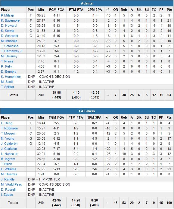 Les deux ex-Lakers Kent Bazemore et Dwight Howard (13 points dans le 1er quart-temps, il se fera ensuite plus discret) terminent respectivement à 21 points à 8/16 et 19 points à 9/13, 9 rebonds, 3 passes et 2 contres. Ils ont été copieusement sifflés par le public californien et Atlanta perdu un 5ème match en 6 rencontres après avoir débuté sa saison sur un 9-2. Los Angeles pallie les absences de Randle et Russell par un effort collectif en attaque : 8 joueurs marquent au moins 7 points.
