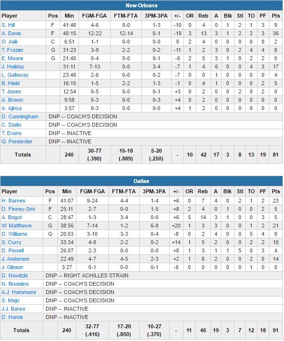 Aucune des deux équipes ne mène de plus de 2 points sur les 10 premières minutes du match. Puis Dallas passe d’un déficit 17-15 à un avantage 26-17 après un 11-0. Davis inscrit lui 13 des 17 premiers points de New Orleans, dont 10 d’affilée, mais son équipe est menée 44-12 à la pause, avant de revenir à égalité 60 partout après 3 quarts-temps. Jrue Holiday (17 points à 7/13, 4 rebonds et 6 passes) donne le plus gros avantage du match aux siens avec deux 3-points (68-62) dans le 4ème quart avant que Matthews ne prenne les choses en main pour Dallas.