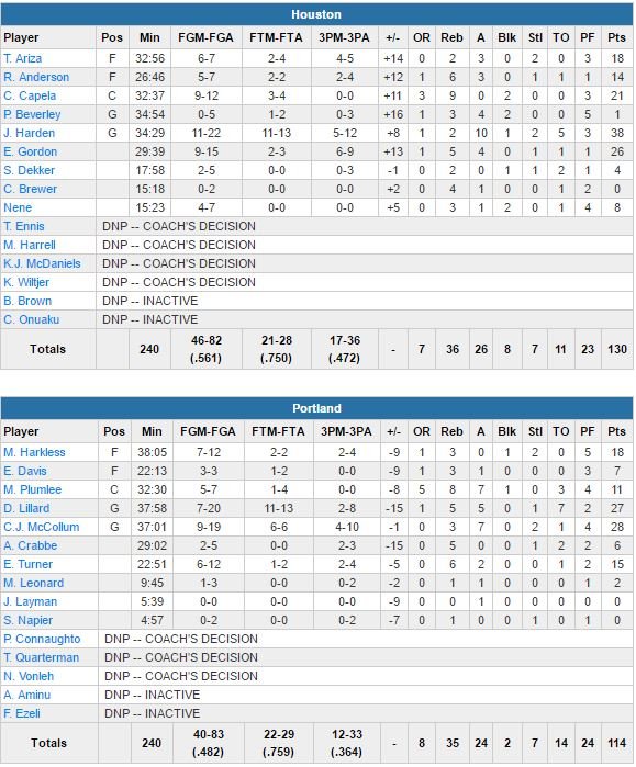 Un double-double et une victoire de plus (7ème d’affilée) pour James Harden (38 points à 11/22, 5/12 à 3-points et 10 passes) et les Rockets cette nuit, vainqueurs des Blazers à Portland, 130-114. Eric Gordon n’était pas mal non plus avec 26 points à 6/9 à 3-points qui permet à Houston d’atteindre la marque des 16 rencontres à au moins 10 trois-points inscrits cette saison (record établi par les Warriors et les Cavaliers la saison dernière égalé).