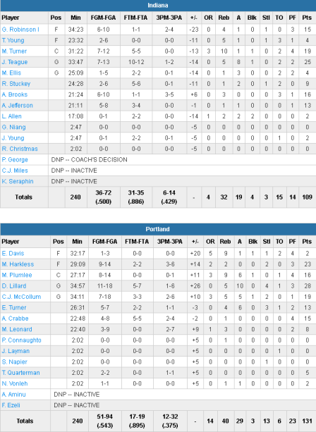 10ème victoire de la saison pour les Blazers, qui écrasent chez eux les Pacers 131 à 109. Ils ont désormais un bilan de 10-10, contre 9-10 aux Pacers de l’ancien Blazer Nate McMillan.