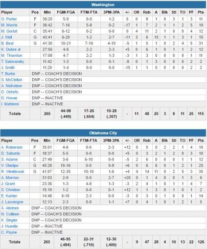 5 autres joueurs du Thunder atteignent la barre des 10 points avec notamment 25 points à 10/16, 6 rebonds et 6 passes signés Victor Oladipo. Bradley Beal plante 31 points (10/21, 5 rebonds), John Wall aligne 15 points et 15 passes et Marcin Gortat 12 points et 11 rebonds pour des Wizards qui restaient sur 3 victoires en 4 matchs.