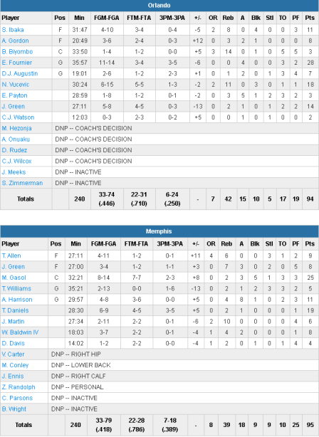 Décimés (Conley, Carter, Randolph et Parsons absents) les Grizzlies ont pu compter sur seulement 9 joueurs en tenue et le shooteur Troy Daniels en a profité pour se montrer avec 19 points. Andrew Harrison ajoute lui 11 points et 8 passes. L’équipe shoote à seulement 41.8% au tir mais perd juste 10 ballons, contre 17 au Magic. En face Evan Fournier sort un gros match avec 28 points à 11/14 dont 3/5 à trois points. Nikola Vucevic sort du banc pour inscrire 18 points alors que Jeff Green en ajoute 14.