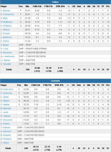 Dans une rencontre qui ne restera pas dans les mémoires, Kemba Walker mène les siens avec 18 points à 7/19 en plus de 5 passes. Michael Kidd-Gilchrist ajoute 14 points alors que pour son retour Nicolas Batum compile 12 points à 4/12, 9 rebonds et 6 passes. Jeremy Lamb (12 points) et Roy Hibbert (11 points) ont été précieux en sortie de banc. Ce banc a marqué 46 points en 25 shoots. En face les Mavs ont été en difficulté offensivement avec seulement 37.2% au tir dont un 9/31 derrière l’arc.Dans cette 10ème défaite lors des 11 dernières rencontres, Harrison Barnes inscrit 17 points à 8/20 en plus de 9 rebonds et Justin Anderson marque 15 points. Deron Williams et Wesley Matthews ajoutent 14 points chacun à respectivement 6/14 et 4/15.