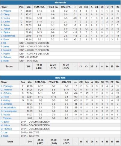 Menés 98-88 après trois quarts-temps, les Timberwolves passent un 12-2 à leurs adversaires pour démarrer le 4ème quart-temps. New York perd 5 ballons sur les 4 premières minutes de la période et Sacramento passe devant pour la première fois du match 102-101 sur un dunk de LaVine à 6’33. O’Quinn enchaîne deux paniers pour restaurer l’avantage des siens et après que Minnesota se soit rapproché à un point, Rose inscrit les 5 points suivants pour redonner un peu d’air aux siens, 110-104. Wiggins trouve un layup à 2’11 mais Anthony lui répond avec un dunk grâce à une passe tout-terrain signée O’Quinn, 112-106. Rose rentre 2 lancers-francs à 31 secondes du buzzer (114-106) et les Wolves ne se rapprocheront ensuite plus à moins de 4 points jusqu’à la fin.