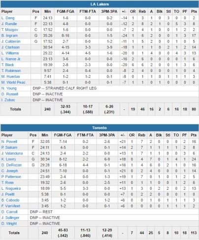 Le choc thermique a été violent pour les Lakers à Toronto cette nuit. Menés par 24 points à 8/12, 4 rebonds et 7 passes de Kyle Lowry et les 16 points à 7/14 du sophomore Norman Powell et de DeMar DeRozan (6/18, 4 rebonds, 6 passes), les Raptors se sont imposés 113-80.
