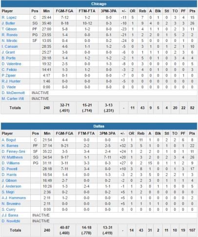 Aucune des deux équipes ne marque durant les premières 2’15 du match mais Dallas enchaîne ensuite sur un 7-0 dans la minute qui suit. Dallas mène 23-6 à 3’17 de la fin de la période, qui se termine par un +17. Andrew Bogut (8 points à 4/4 et 11 rebonds) y signe 6 points et 8 rebonds. Chicago trouve les ressources nécessaires pour revenir 3 fois à 6 points dans le 2ème quart mais Dallas reste devant 57-45 à la pause. Matthews marque 14 points dans le 3ème quart-temps (qui se termine sur le score de 82-66) et l’écart monte jusqu’à 21 points.