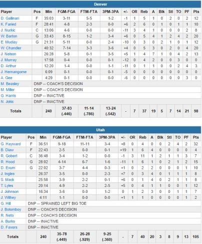 Rodney Hood ajoute 15 points (4/14 et 6 rebonds) et Rudy Gobert 7 points à 3/4, 11 rebonds et 2 contres alors qu’en face, Denver compte 2 joueurs à 20 points avec Wilson Chandler et Will Barton. La première mi-temps est synonyme de maladresse pour les deux équipes, qui combinent pour un 4/15 longue distance. Le Jazz prend tout de même 2 points d’avance à la pause, 49-47, alors qu’aucune des deux équipes n’a jusque-là réussi un vrai run. Malgré 7 trois-points réussis dans le 4ème quart-temps, les Nuggets (13 trois-points, record en saison égalé) n’ont pas réussi leur comeback.