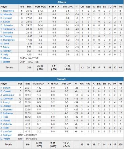 À noter : Paul Millsap a manqué son 3ème match consécutif suite à une blessure à la hanche gauche. DeMarre Carroll a atteint les 10 points pour la 9ème fois d’affilée. Toronto a marqué 60 points dans la peinture, Atlanta seulement 36. Le banc des Raptors a également dominé, 64-38.