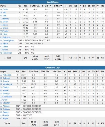 Sa moyenne cette saison est désormais de 31 points, 10.8 rebonds et 11.3 passes en 21 matchs (10 tripe-doubles cette saison et 47 en carrière). À ses côtés, un Enes Kanter à 17 points et 10 rebonds et un Victor Oladipo à 15 points, 5 rebonds et 4 passes. Anthony Davis, meilleur scoreur NBA, signe lui 37 points à 14/32, 15 rebonds et 4 contres. Buddy Hield, tout juste sorti de 4 ans à l’université d’Oklahoma (6ème choix de la draft), signe 16 points. OKC est devant 49-41 à la pause derrière 12 points, 9 rebonds et 6 passes de Westbrook (24 points et 10 rebonds pour Davis).