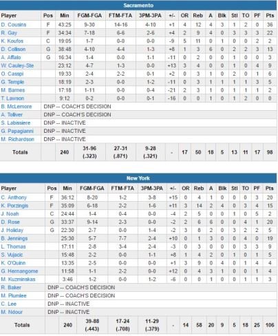 Brandon Jennings ajoute 19 points à 5/7 et 3 passes, Kristaps Porzingis 15 points et 14 rebonds. DeMarcus Cousins signe 36 points et 12 rebonds mais shoote à 9/30. Le pivot est apparu fatigué après avoir joué l’intégralité de la seconde mi-temps. À l’aide d’un 18-4, New York prend 7 points d’avance 48-27 en milieu de 2ème quart et est à +19 dans le 3ème quart avant d’envoyer à de trop nombreuses reprises ses adversaires sur la ligne et de subir le fameux 18-0 qui va ramener Sacramento à 1 point, 72-71, en fin de période. Devant de 2 points à 5 minutes de la fin, les Knicks sont relancés par un 3-points d’Anthony qui initie à 7-2 décisif. Sacramento (32.3% de réussite sur ce match) perd son 3ème match consécutif.