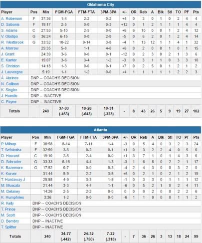 Ses 29 points en seconde mi-temps envoie donc les Hawks vers une 7ème défaite consécutive et une 10ème sur les 11 derniers matchs. Mike Budenholzer avait décidé de bencher Kyle Korver pour titulariser Thabo Sefolosha mais rien n’y a fait face à un Westbrook sur une autre planète, pas même le retour de Paul Millsap (24 points) après 3 matchs d’absence (hanche). Atlanta, qui passe un 30-19 à ses visiteurs dans le dernier quart, a tout de même eu dans les mains le shoot pour envoyer le match en prolongation après que Korver ait provoqué un entre-deux. OKC défend bien sur la remise en jeu et la tentative de Tim Hardaway Jr à 3-points ne touche même pas le cercle.