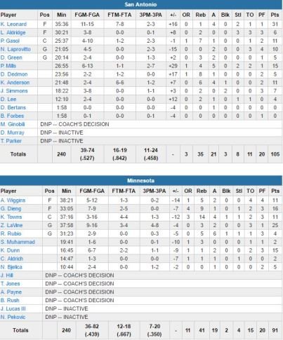 Sans Tony Parker (genou gauche) et avec un Kawhi Leonard à 0 point dans le 1er quart mais qui termine à 31 points à 11/15 et 4 rebonds, San Antonio (52.7% aux tirs) a décroché cette nuit une 13ème victoire en autant de matchs à l’extérieur chez les Wolves (43.9%), 105-91.